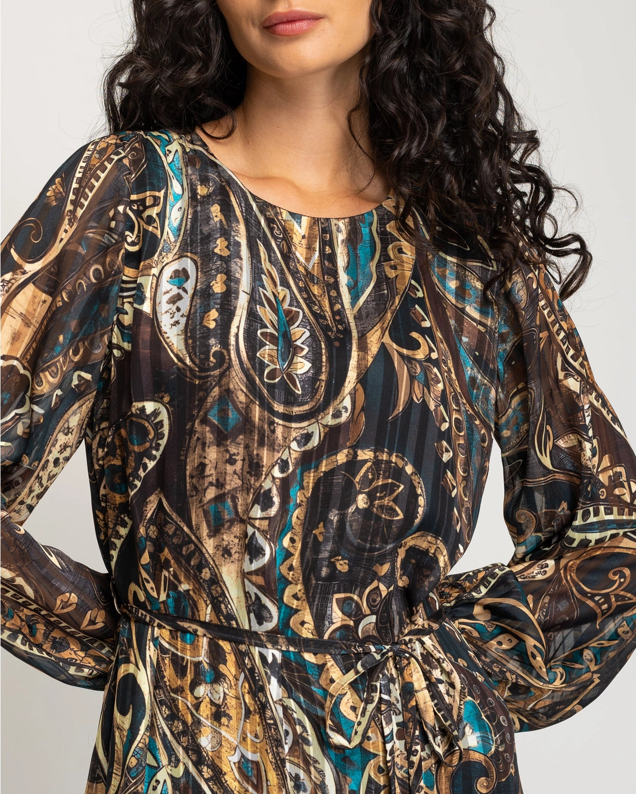 Print, shine, and movement come together in this dress to create a piece with character and its own style. The round neckline and long sleeve silhouette delicately cinches at the waist with a fine belt, while the slightly flared hem adds dynamism and femininity. A perfect dress for daytime looks with an artistic and elegant essence.