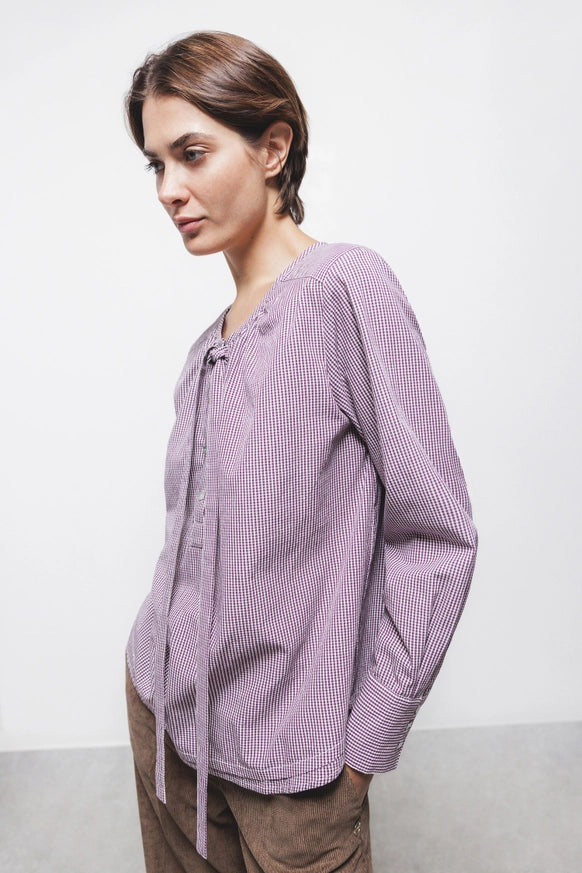 Blouse with checkered print in dark red and white colours. Long sleeves with cuffs and round neckline. Front tie detail with contrasting buttons.